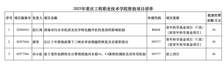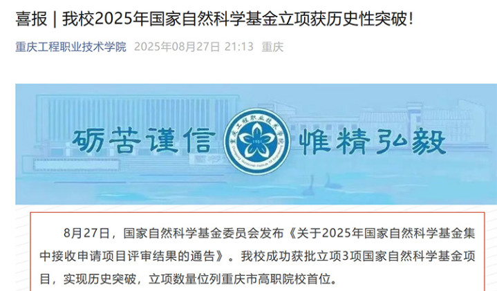 重庆工程职业技术学院成功获批立项3项国家自然科学基金项目,实现历史突破,立项数量位列重庆市高职院校首位。