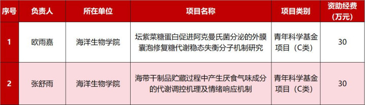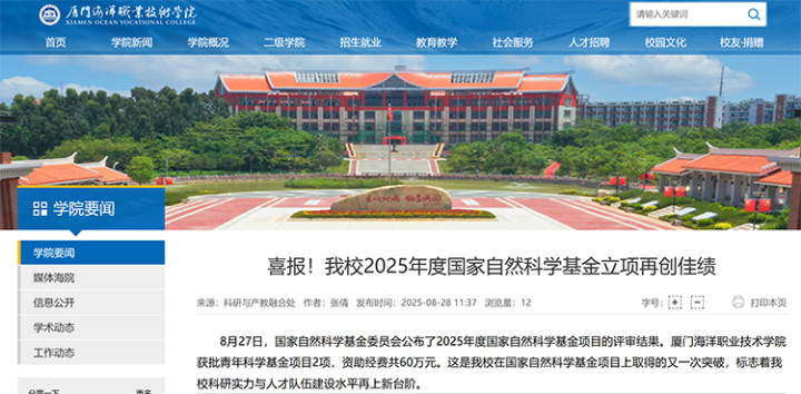 厦门海洋职业技术学院获批青年科学基金项目2项,资助经费共60万元。这是该校在国家自然科学基金项目上取得的又一次突破,标志着学校科研实力与人才队伍建设水平再上新台阶。