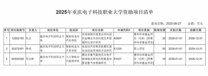 重庆电子科技职业大学成功获批立项3项国家自然科学基金项目,其中:面上项目1项,青年科学基金项目2项,共获批准经费110万元,实现历史性突破,立项数和批准经费位列重庆市职业院校首位。