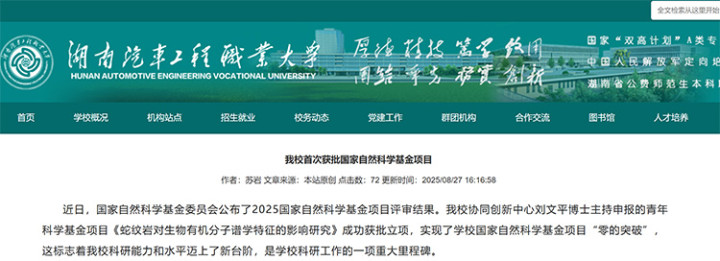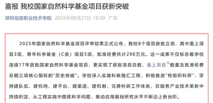 8月27日,国家自然科学基金委员会公布2025年国家自然科学基金集中接收申请项目评审结果。据不完全统计,目前已有海南科技职业大学、重庆电子科技职业大学、铜仁职业技术大学、湖南汽车工程职业大学、深圳信息职业技术学院、厦门海洋职业技术学院、重庆工程职业技术学院等职业院校公布获资助项目情况,多所学校获历史性突破。