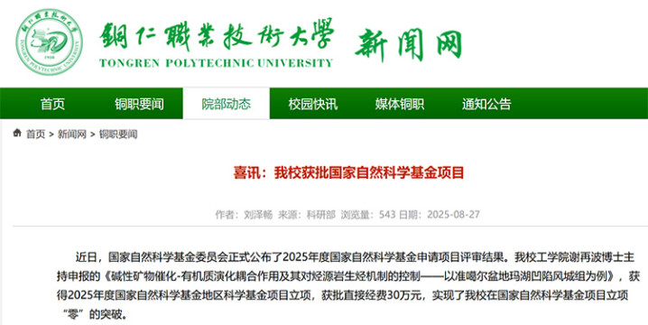 铜仁职业技术大学工学院谢再波博士主持申报的《碱性矿物催化-有机质演化耦合作用及其对烃源岩生烃机制的控制——以准噶尔盆地玛湖凹陷风城组为例》,获得2025年度国家自然科学基金地区科学基金项目立项,获批直接经费30万元,实现了学校在国家自然科学基金项目立项“零”的突破。